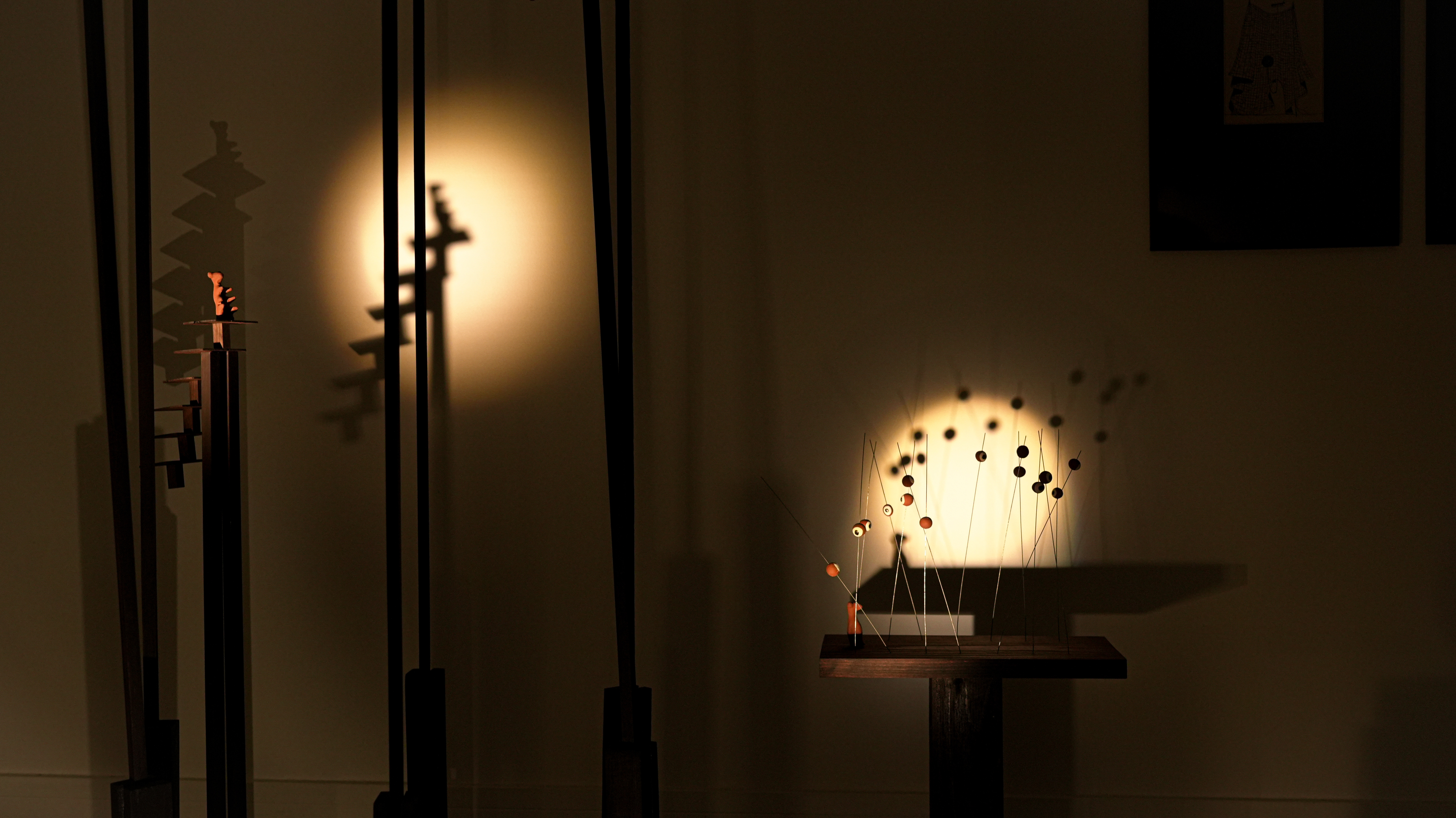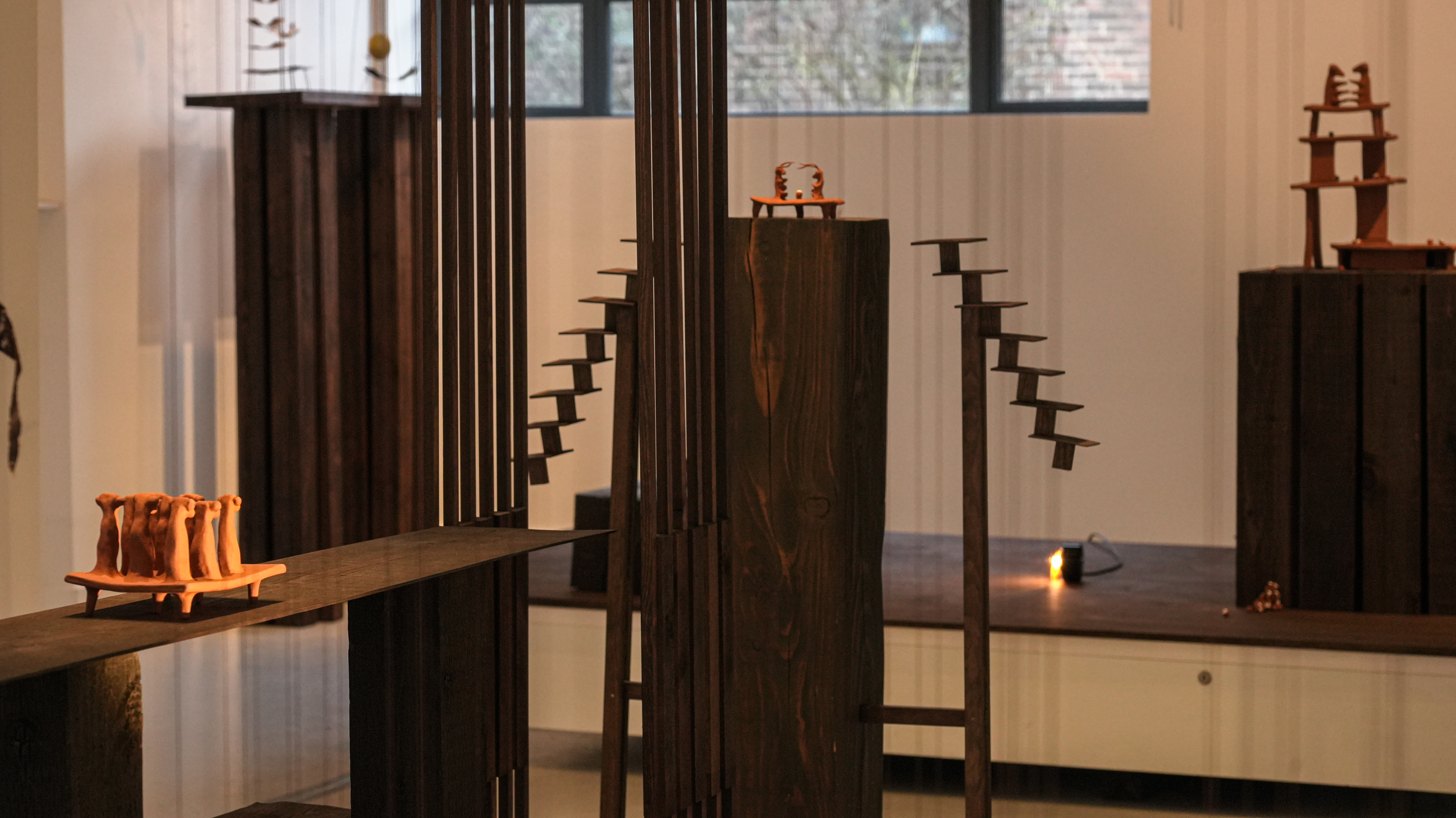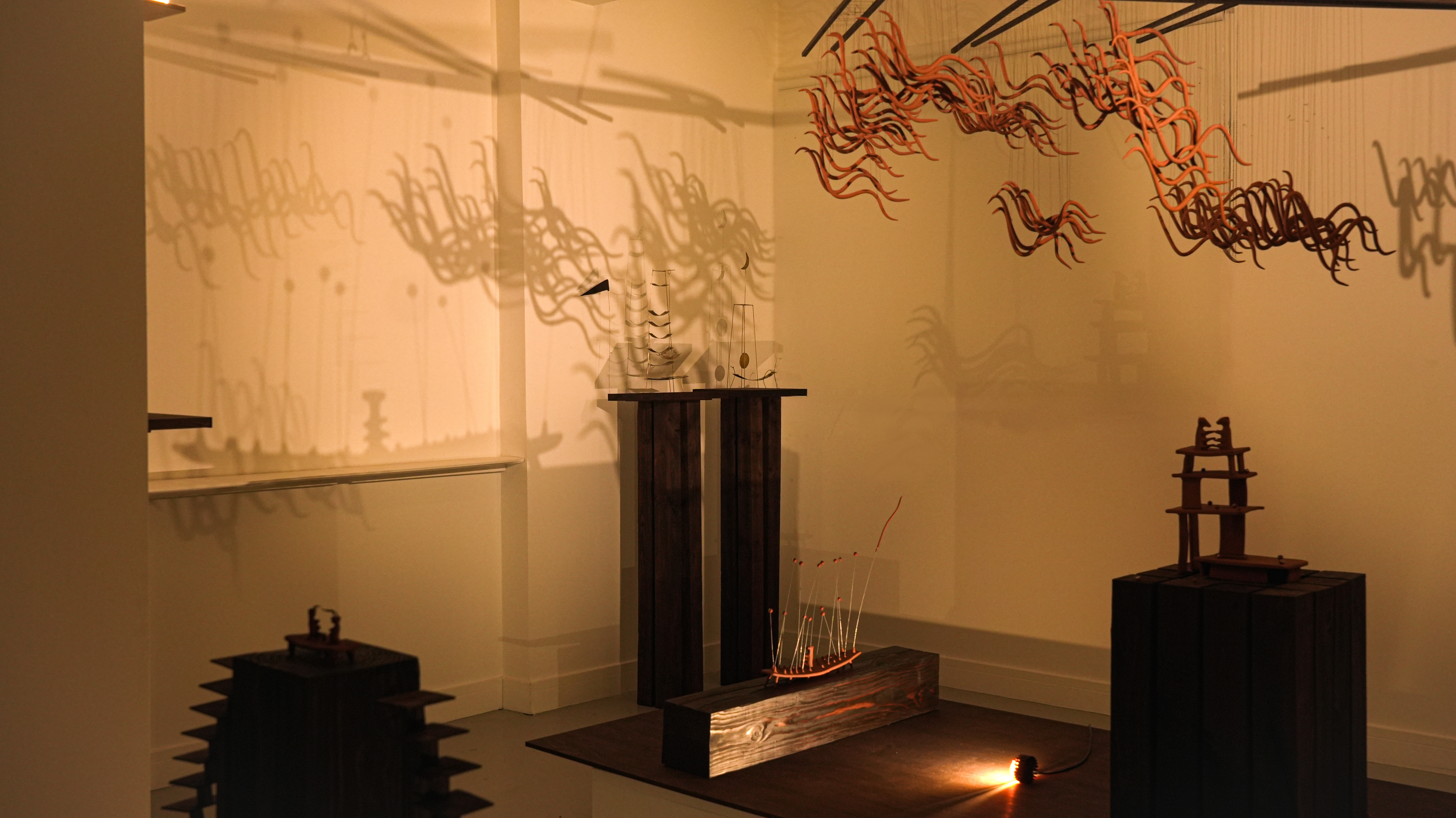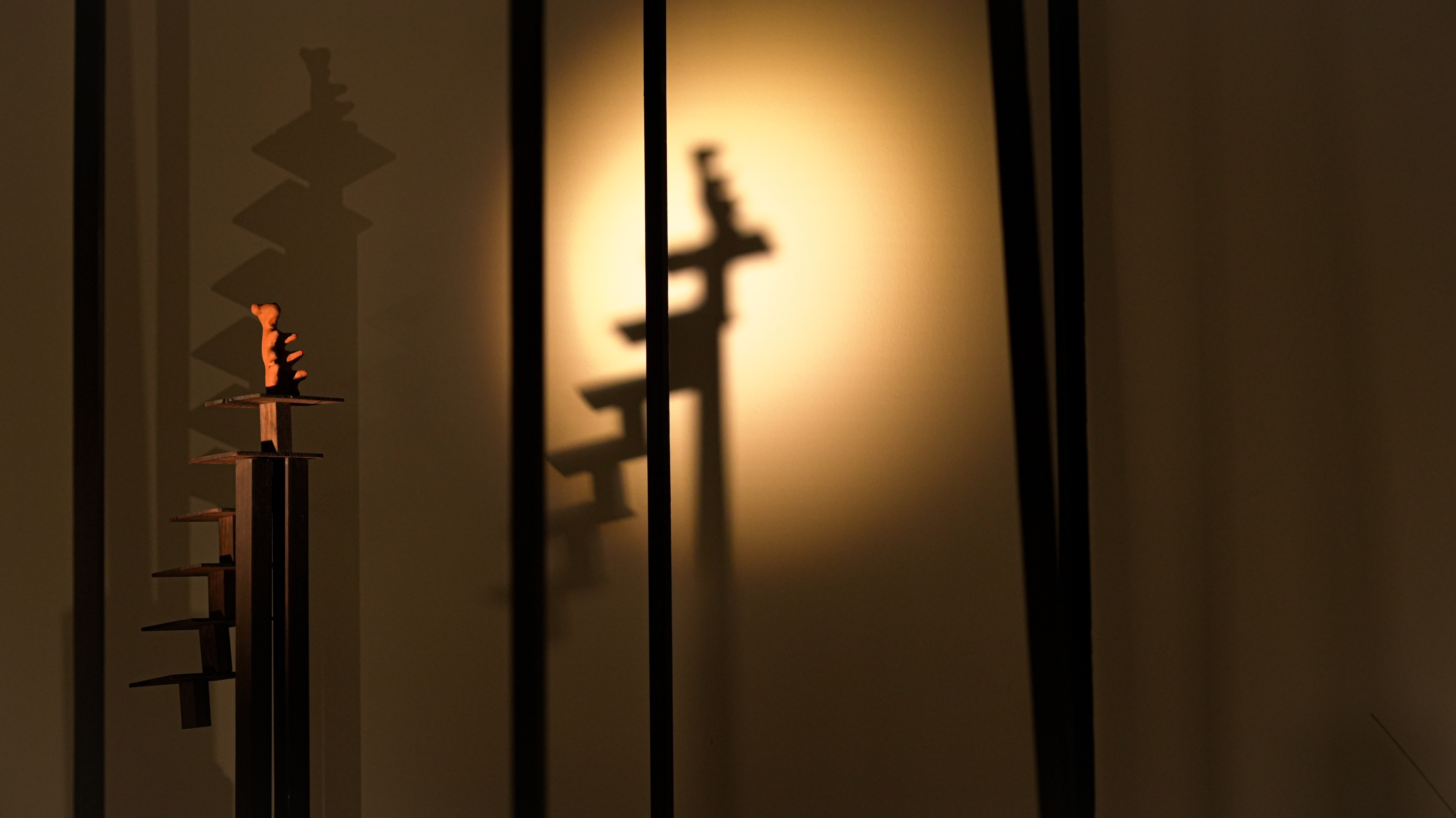 Each sculpture is staged in timber structures, referencing circus and Asian architecture, generating a ritualistic scenography. Small lights move, turn on and off within the installation, casting shifting shadows on the surrounding walls, revealing at times different acts of the theater taking place in the hidden depths of the soil.