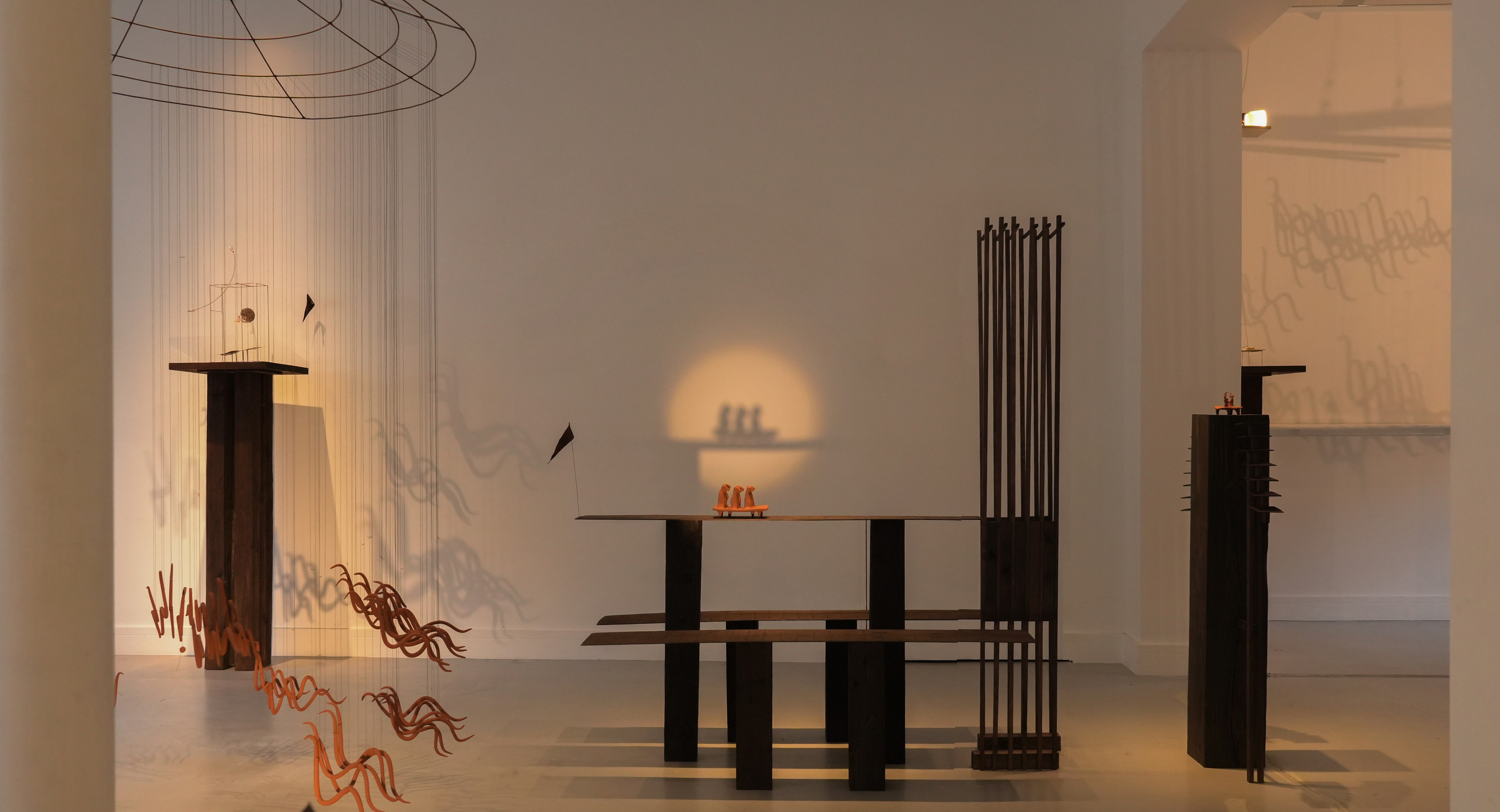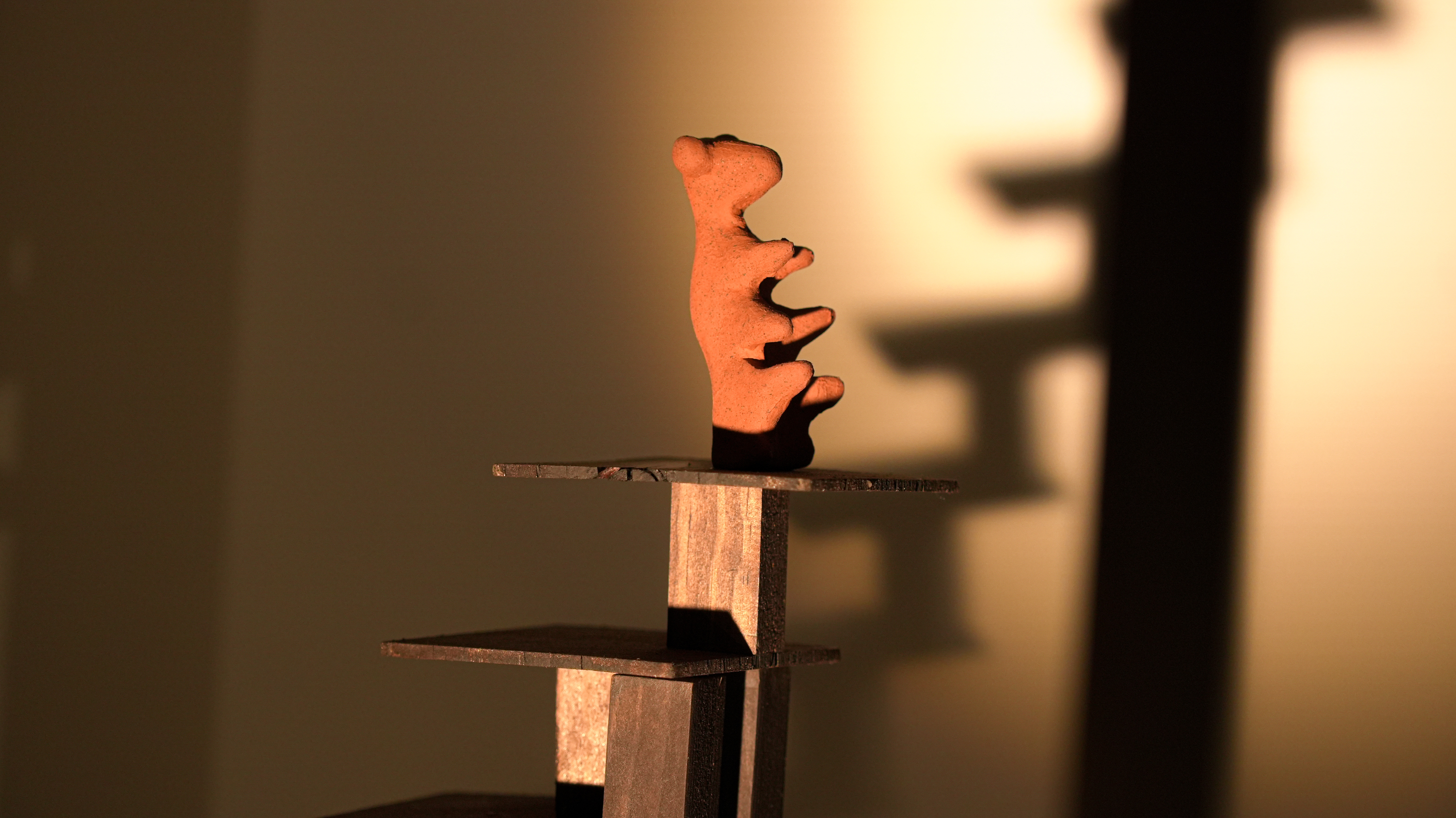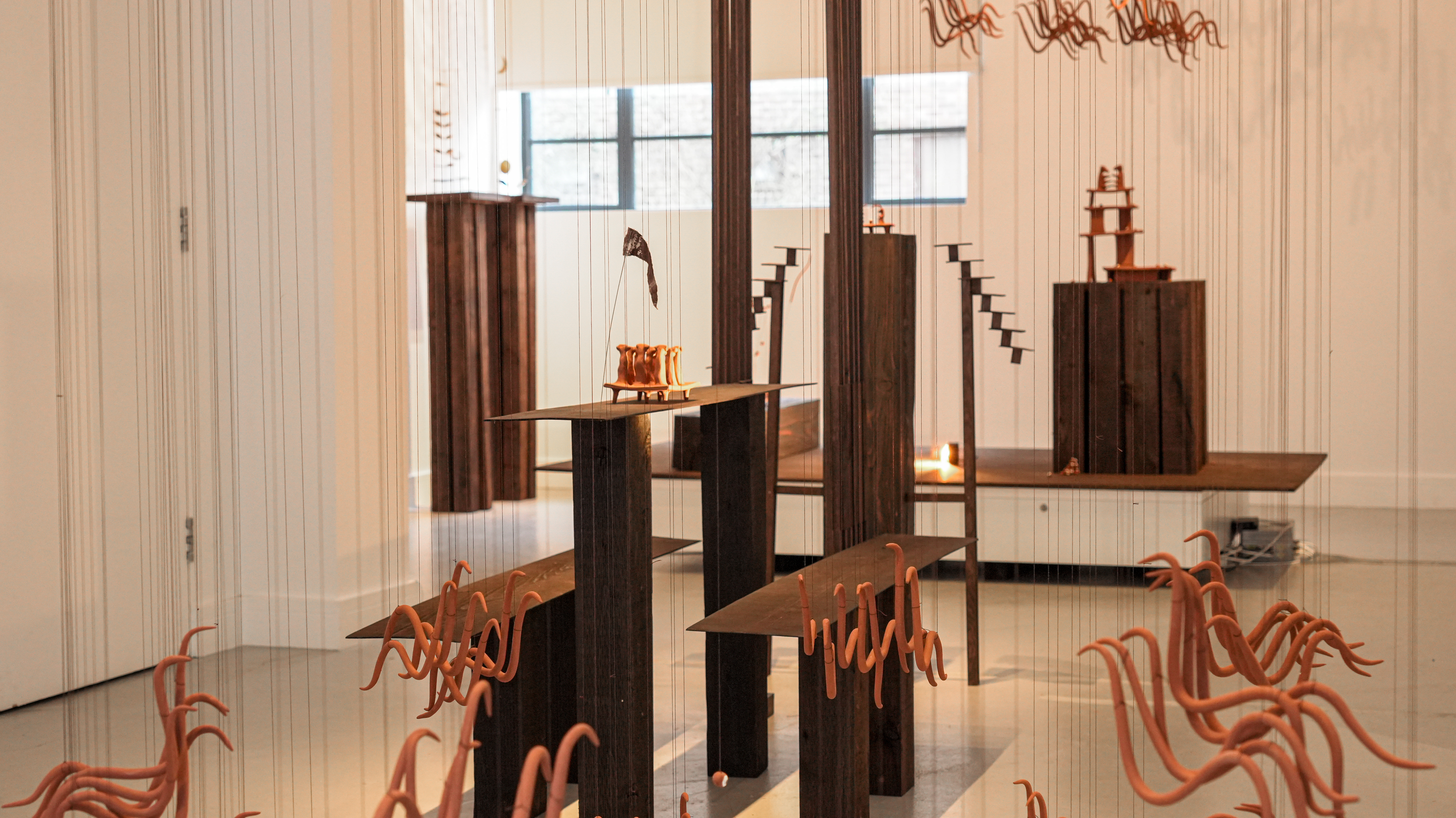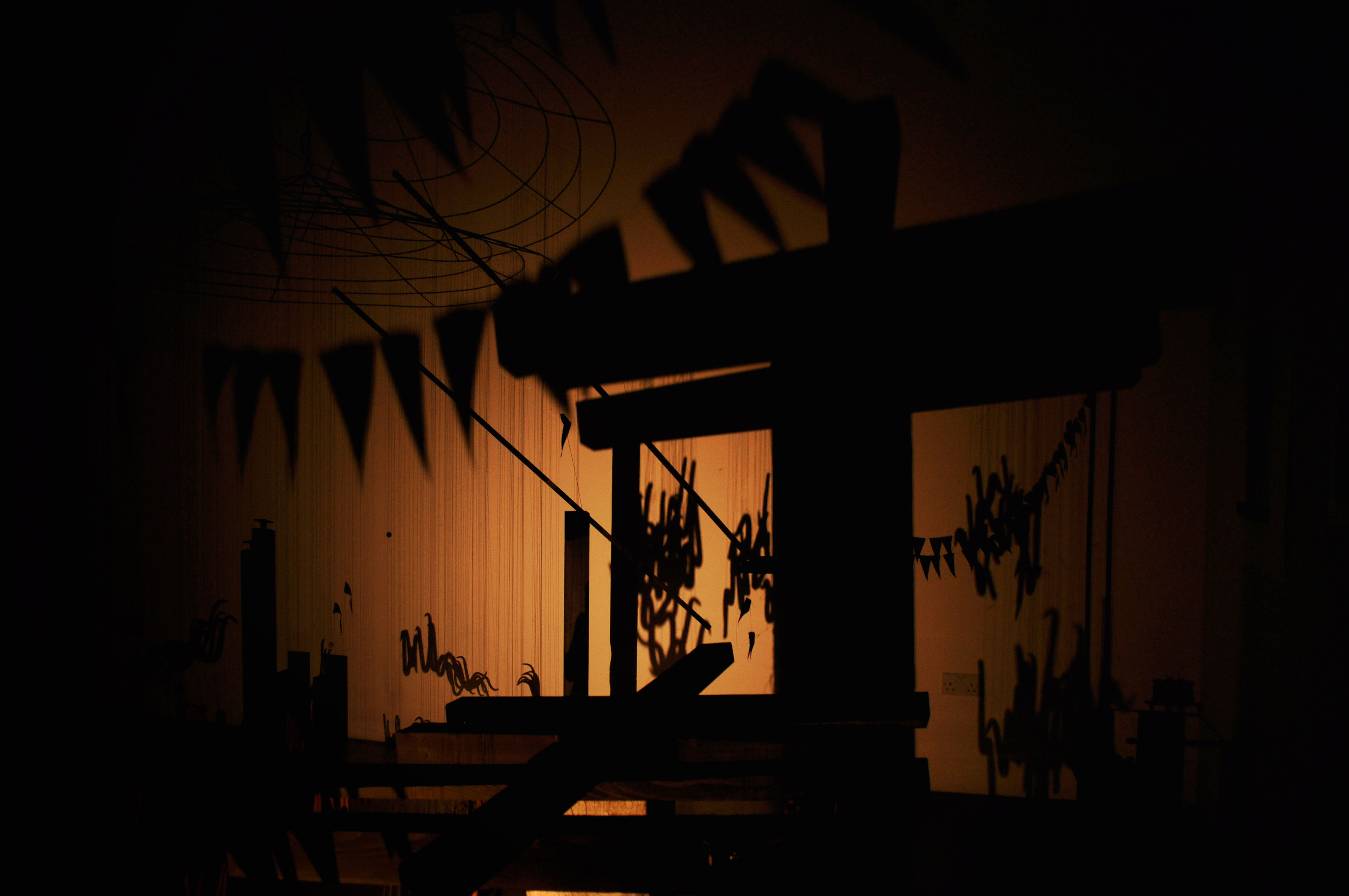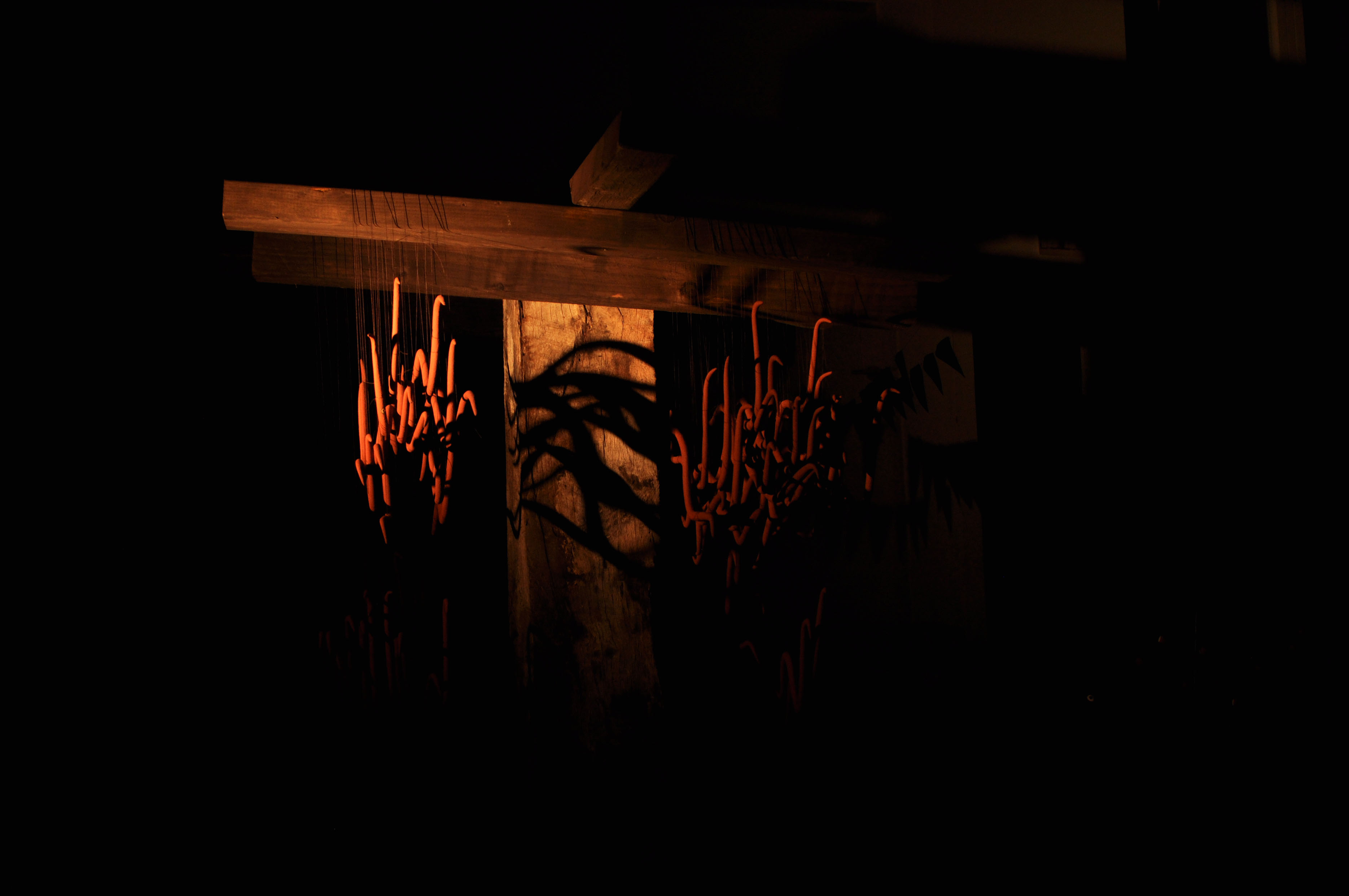 Each sculpture is staged in timber structures, referencing circus and Asian architecture, generating a ritualistic scenography. Small lights move, turn on and off within the installation, casting shifting shadows on the surrounding walls, revealing at times different acts of the theater taking place in the hidden depths of the soil.
