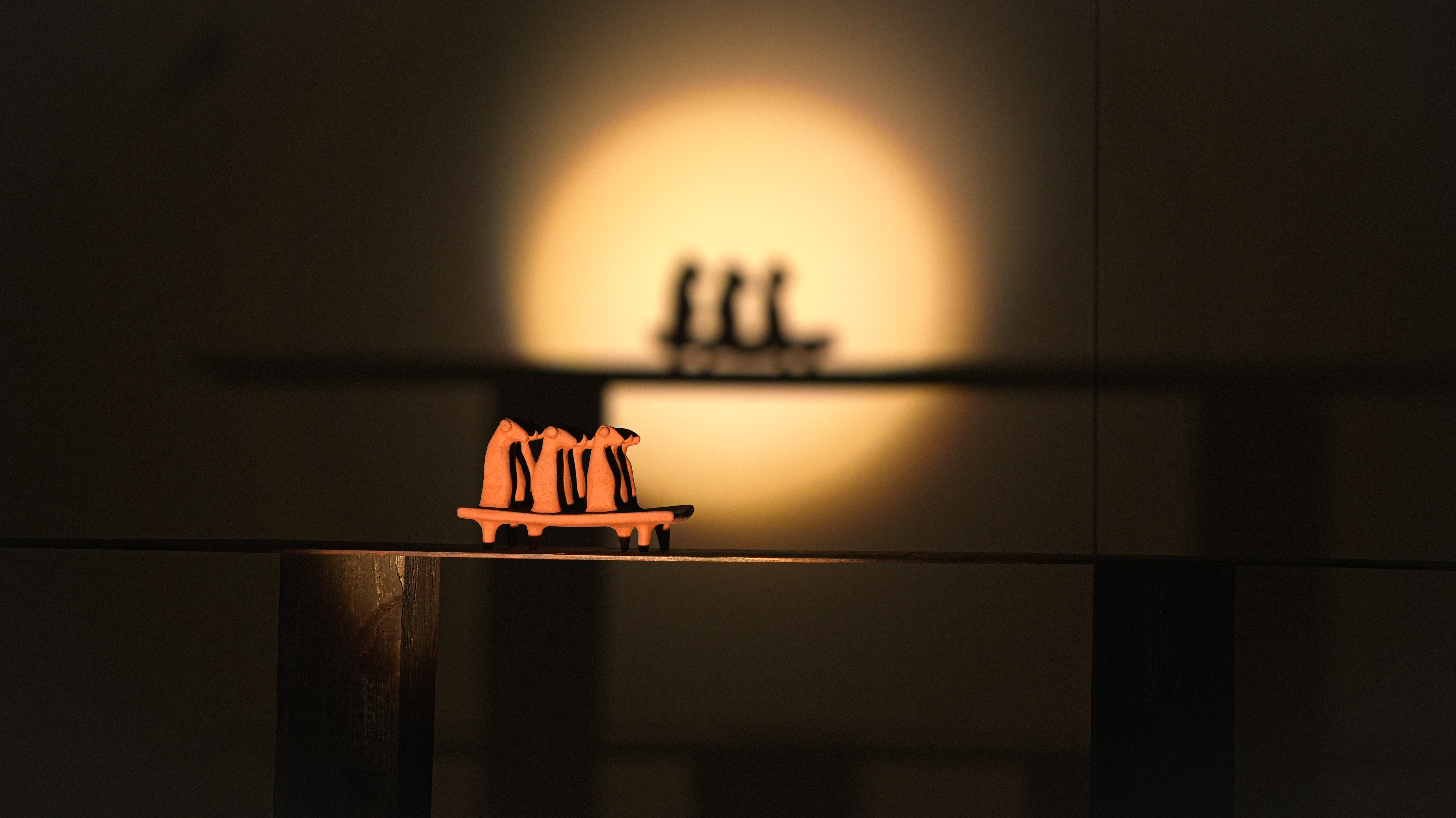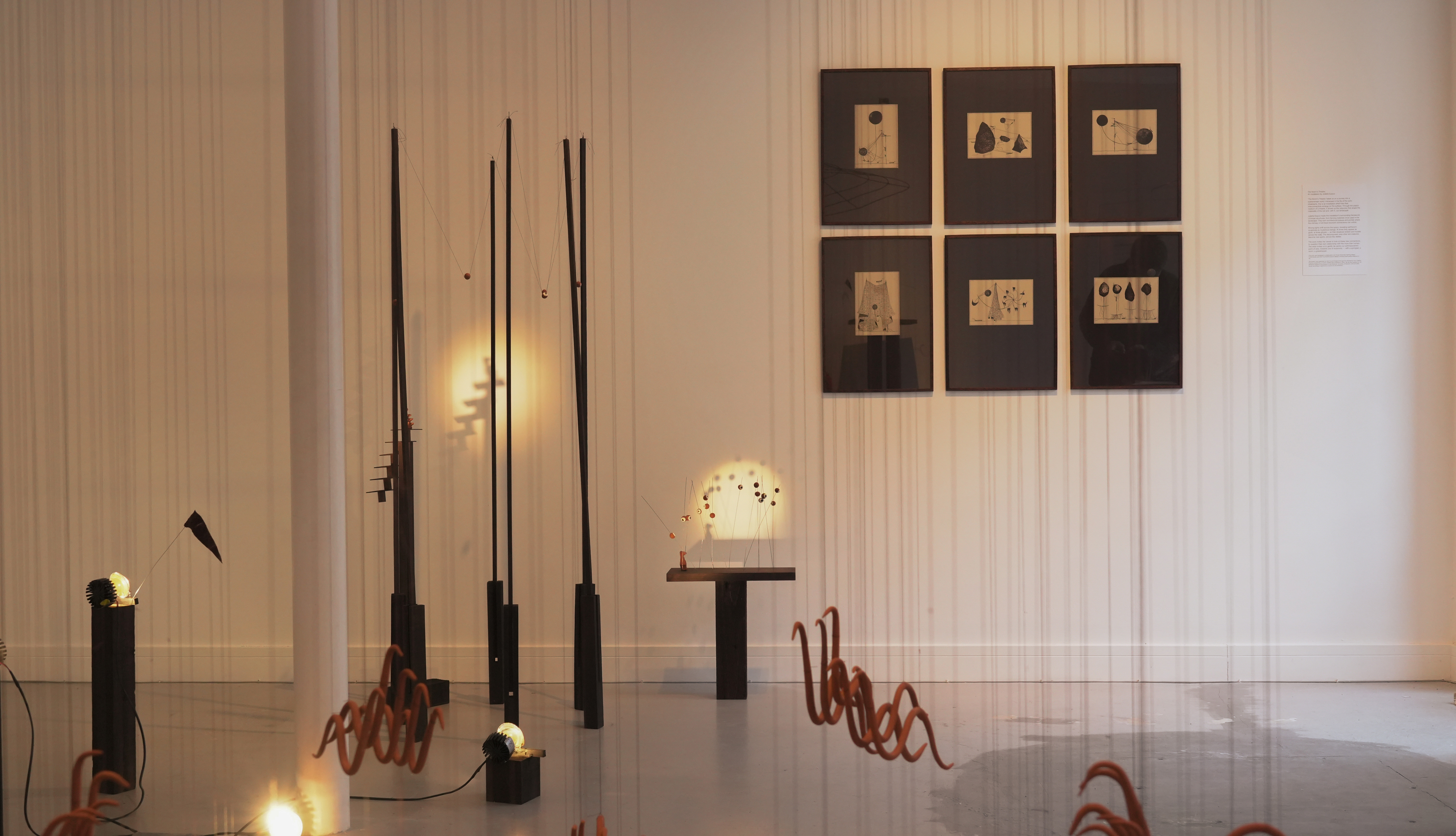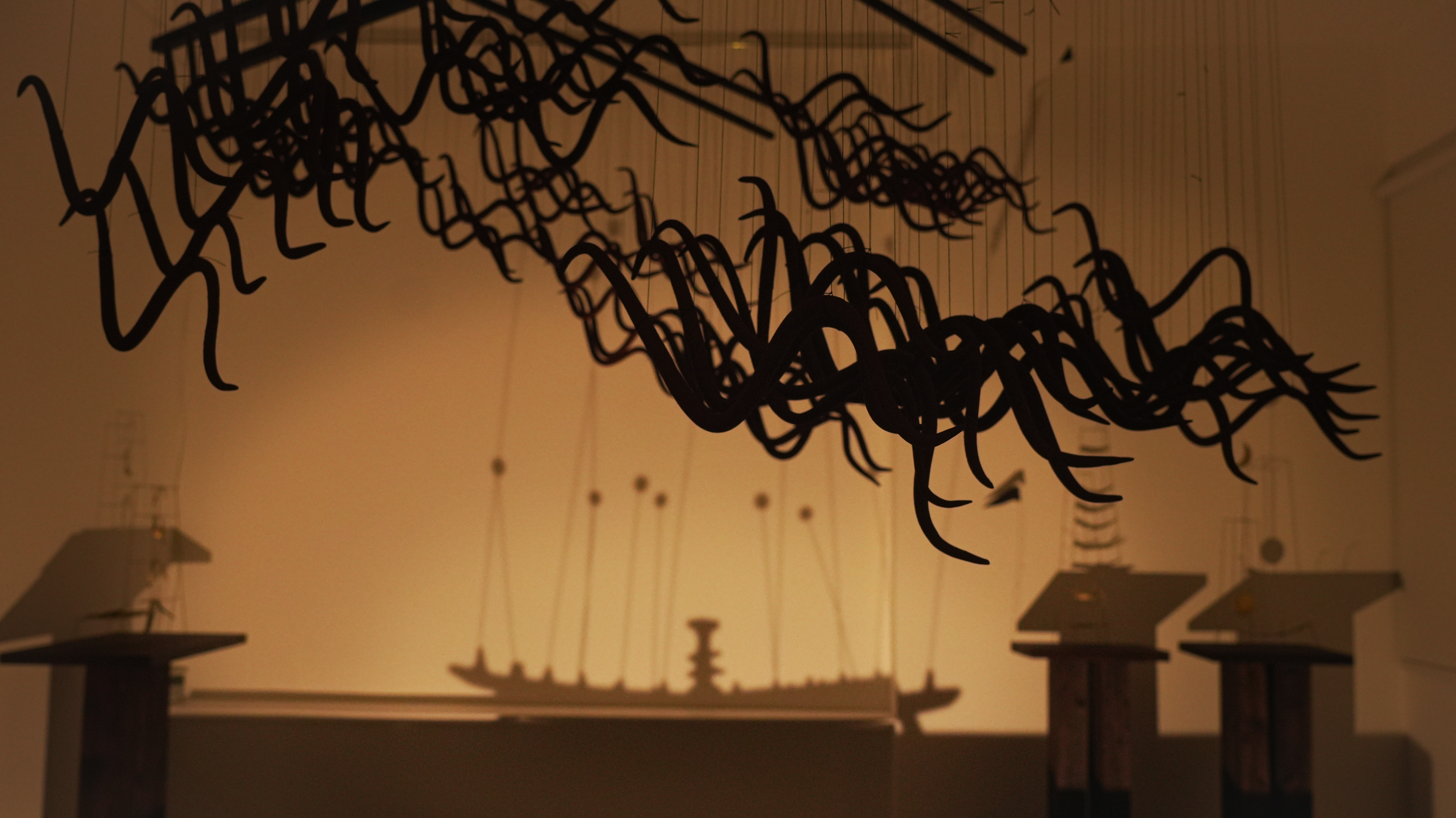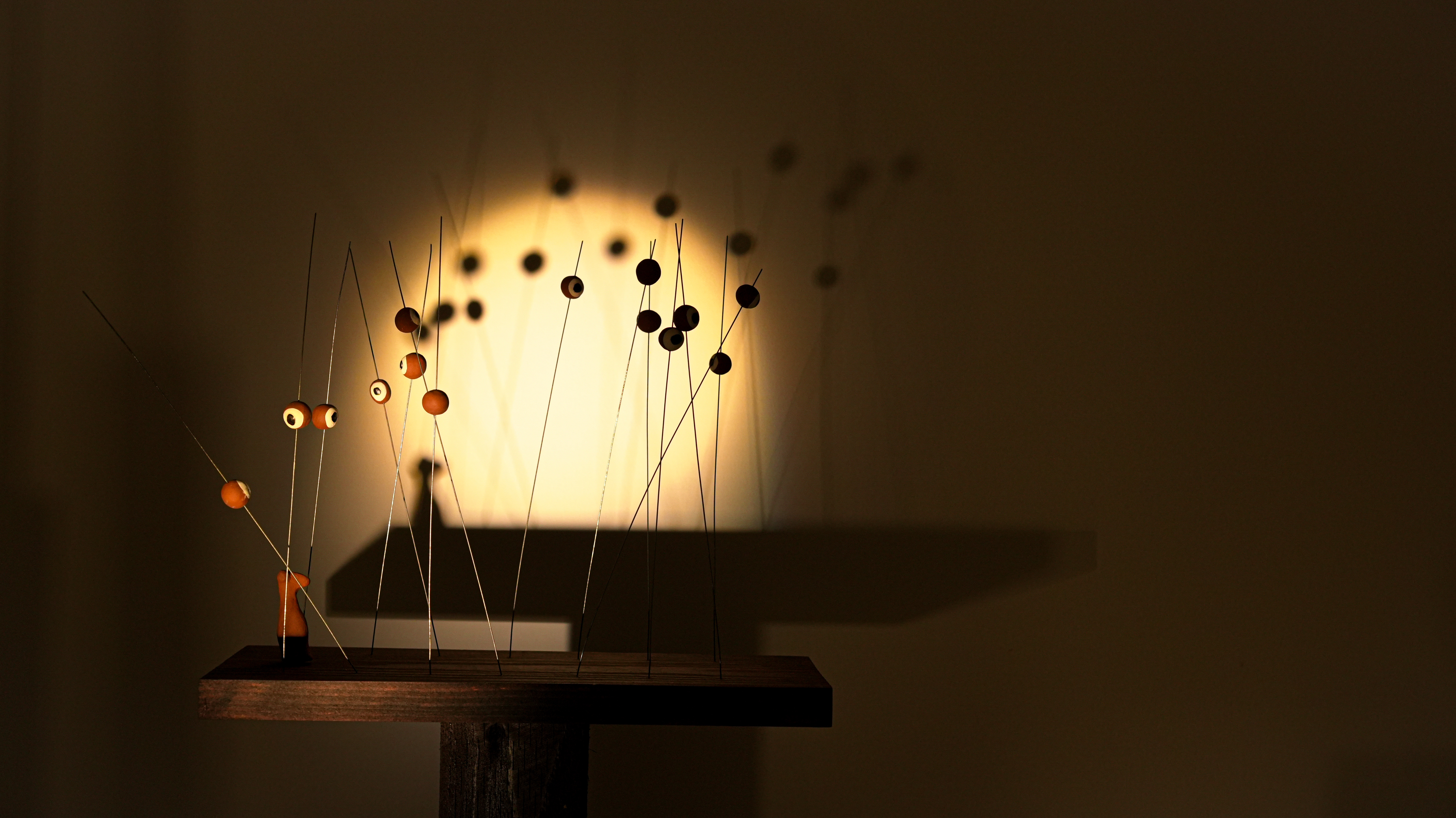 Each sculpture is staged in timber structures, referencing circus and Asian architecture, generating a ritualistic scenography. Small lights move, turn on and off within the installation, casting shifting shadows on the surrounding walls, revealing at times different acts of the theater taking place in the hidden depths of the soil.