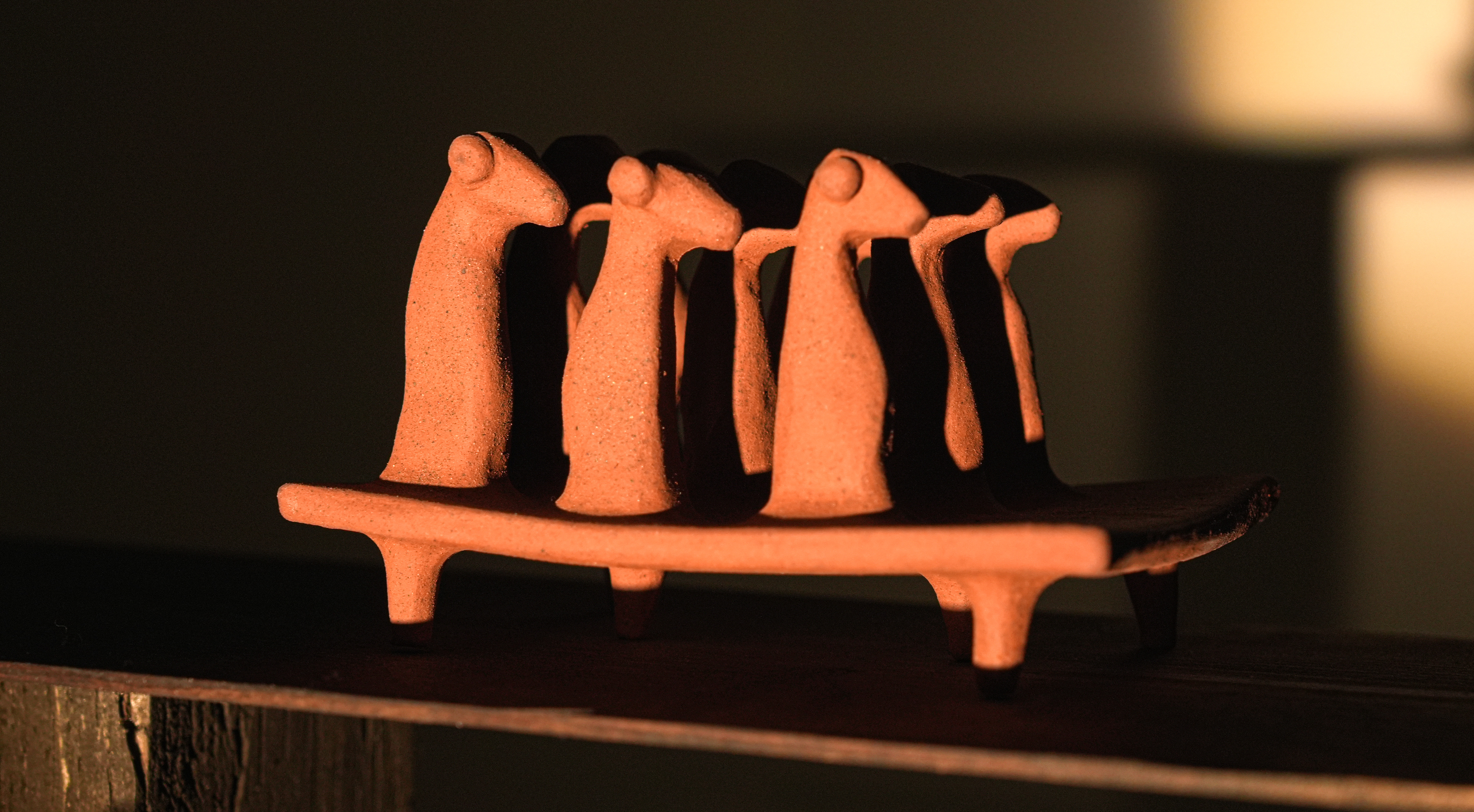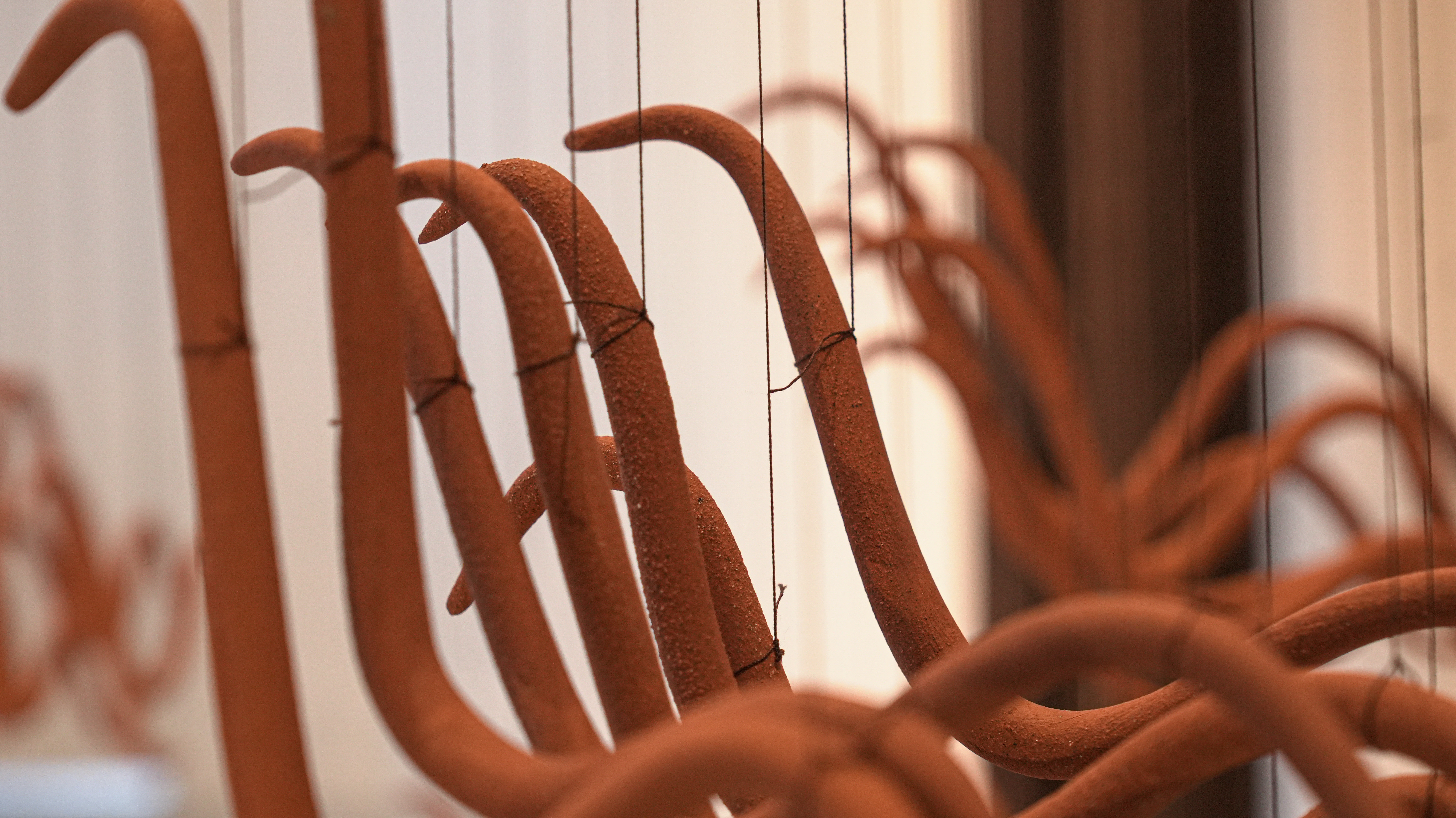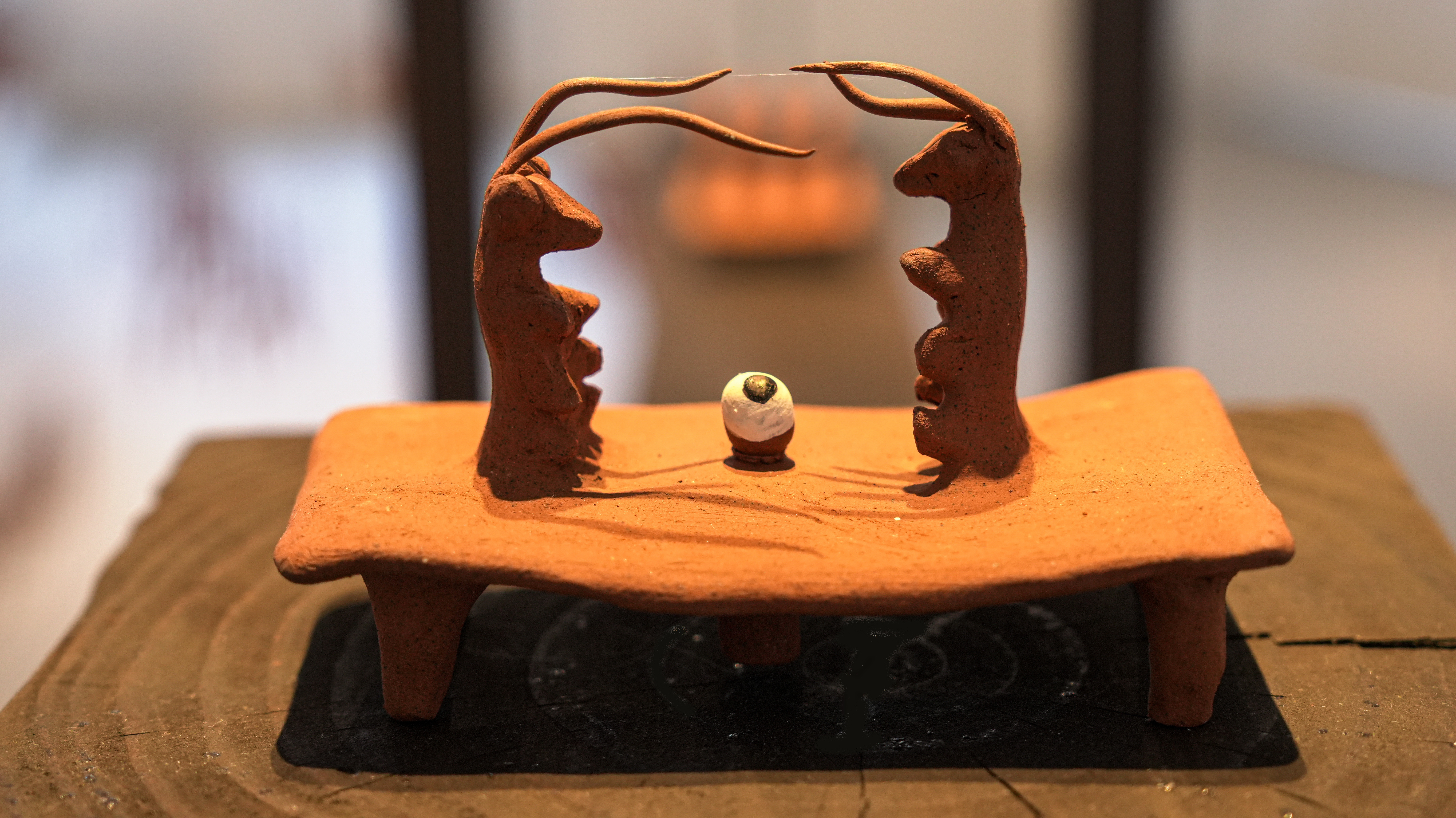 The clay sculptures are inspired by Minoan ritual objects of the late Bronze Age, elevating the fauna of the soil and the eye motif to a sacred status. The eye being a key symbol alluding both to the soil’s secret fauna and to the human gaze: bringing forward the subject of observation.